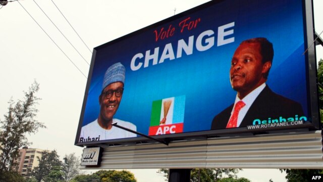 FILE - An electronic billboard displays a campaign poster of All Progressives Congress presidential candidate Mohammadu Buhari and running mate Yemi Osinbajo, who this week won Nigeria's democratic election.